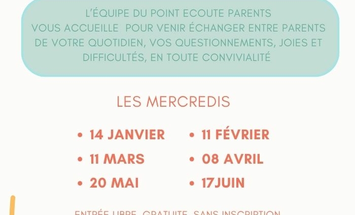 L’équipe du Point Ecoute Parents vous accueille pour venir échanger entre parents de votre quotidien, vos questionnements, joies et difficultés, en toute convivialité. Une activité pour vos enfants sera proposée en même temps.